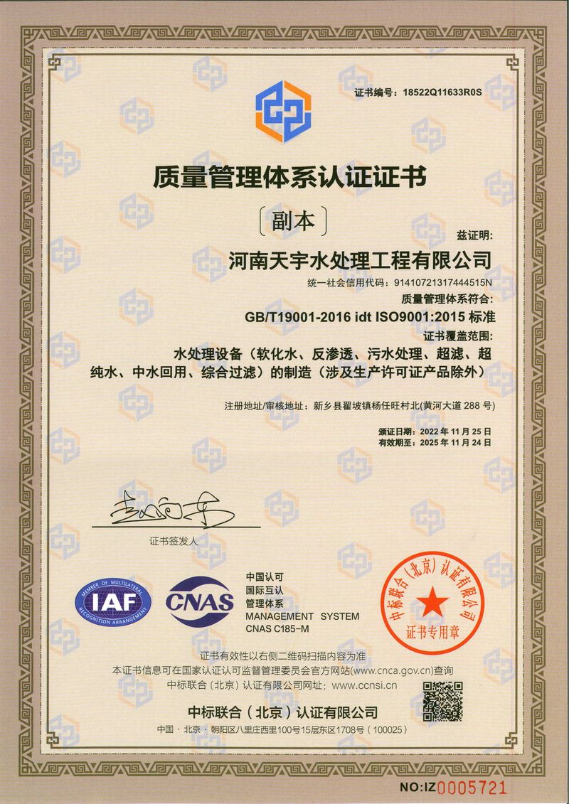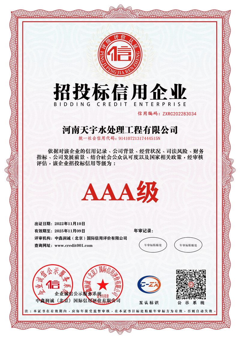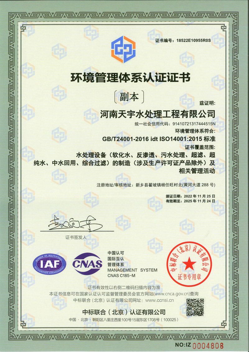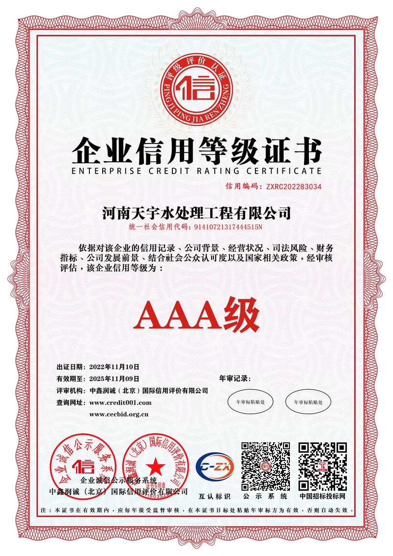河南天宇水處理工程有限公司是一家從事水處理設備及系統的設計、制造、安裝、調試、技術開發和配套材料銷售的水處理高科技企業。本公司以歐盟技術為依托,吸收培養了大批博士研究生、工程師、工程師等科研人才。